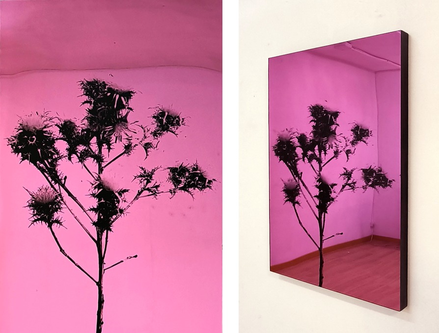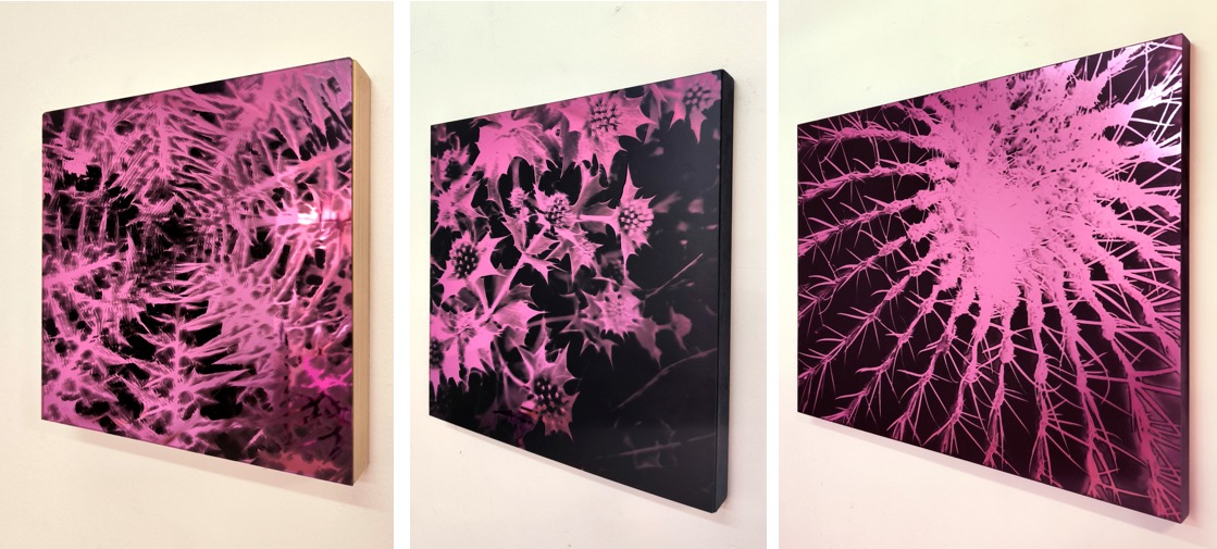Una calidez madrileña que el artista capitalino Jorge García1, igual conoce al dedillo, y por eso, la enfría. La artificializa exageradamente, casi barroquizándola en sus post-industriales y ultrasintéticas obras foto-objetuales. Ya sé que suena raro, pero es que eso es lo que hace, cuando el madrileño metaliza la mirada en un espejeante rosado que la invade y luego lo entinta con impresiones fotográficas de alto contrate, de flores secas, cactus o cardos. Donde la belleza rosa, de ese color que todo lo ablanda o añoña y que tan de moda ha puesto el nuevo arte millenials, es invadida gráficamente por imágenes espinosas que nos hieren la retina.