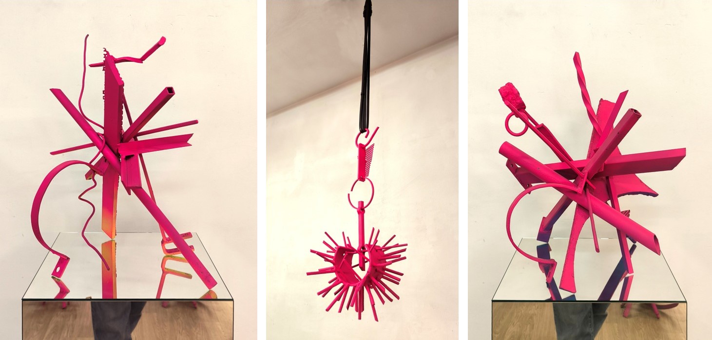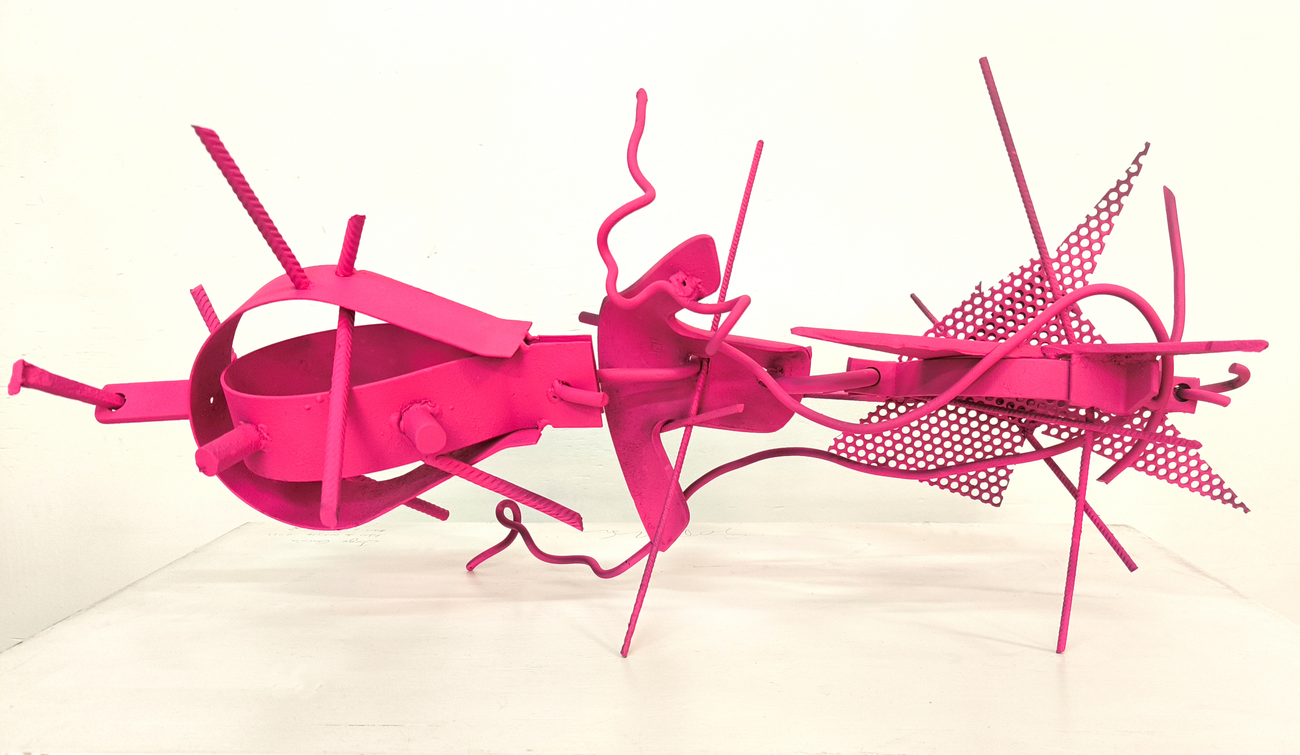 Como si García pretendiera industrializar el reflejo de nosotros mismos, recordándonos que todo se marchita, todo desaparece, todo muere, o lo contrario, bello tú mientras la muerte te rodea o te brota de dentro, porque el humano es un animal vírico, expansivo, tóxico. Así como tóxico es el chillón y violento color fucsia de sus alambradas, sus yaquis de metal, que imitan pequeñas miniaturas de esas estructuras metálicas y de madera de grandes dimensiones que se usan para obstaculizar las tropas de tierra de las guerras convencionales, esas mismas que están a punto de desaparecer desplazadas por la guerra panhumana de las máquinas. Esta vez, cuidando nuestro espacio interior, hogareño, doméstico, nuestro soñado jardín de esculturas violentas, bellas pero dañinas si te descuidas ante sus filosos pétalos y pistilos metálicos2.